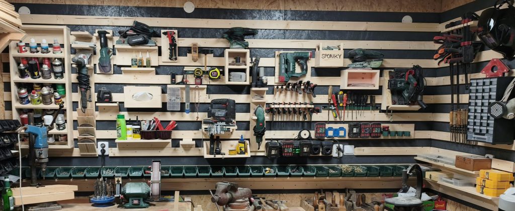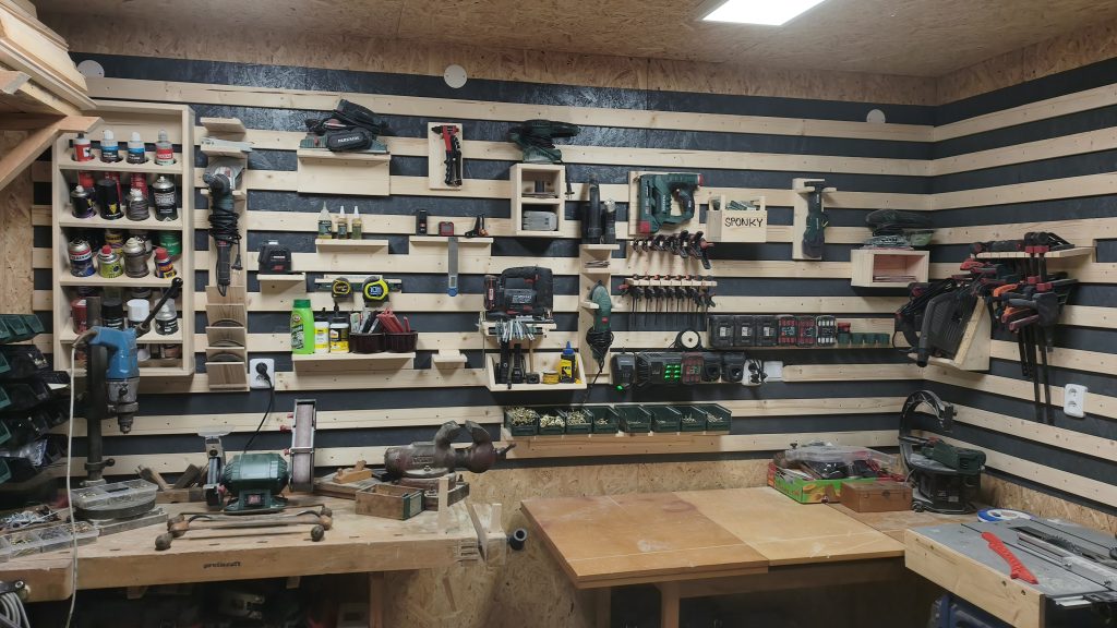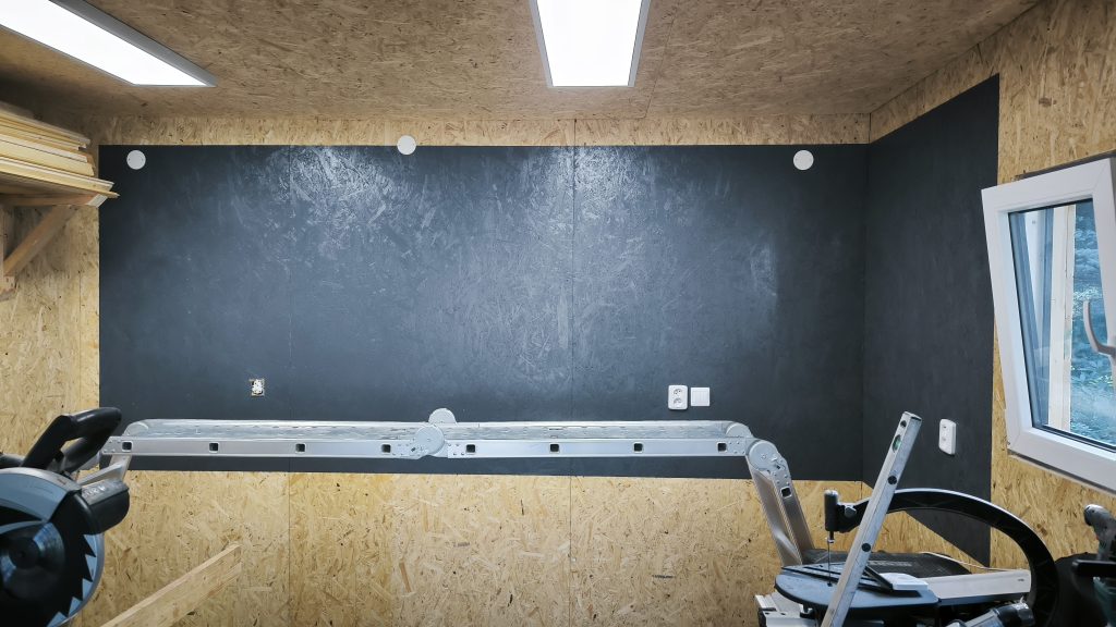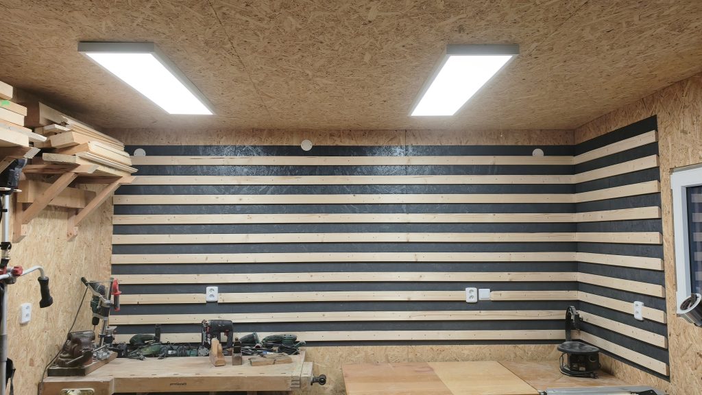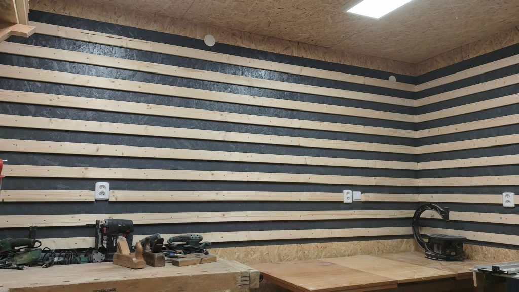Latě máme hotové a je čas na jejich instalaci na zeď. Začneme hezky od spodu. Připravil jsem si starý CD profil, který mi zbyl. U něj máte jistotu, že je rovný u dřeva je to už horší. CD profil navrtáme do zdi a přiložíme první lať. Vyrobil jsem si šablonu z dlouhého prkna, která mi přesně vymezila vzdálenosti mezi jednotlivými latěmi. Rovinnost jsem kontroloval pomocí laserové vodováhy. Pokud máte ve zdi elektro rozvody, postupujte opatrně. Šrouby jsem zvolil s TX hlavou a roměrem 4x30mm do OSB.