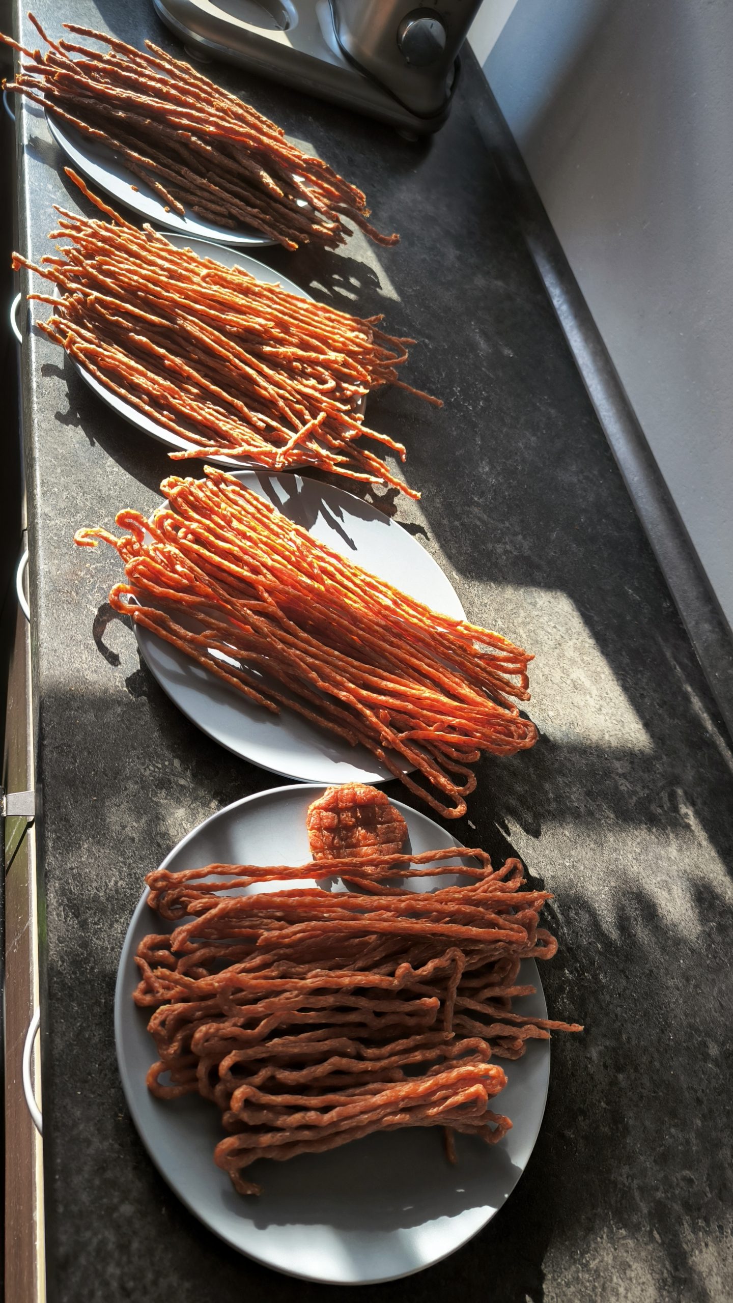 Sušené hovězí nebo vepřové maso, jemně namleté a tvarované do malých tyčinek pomocí plnící pistole.